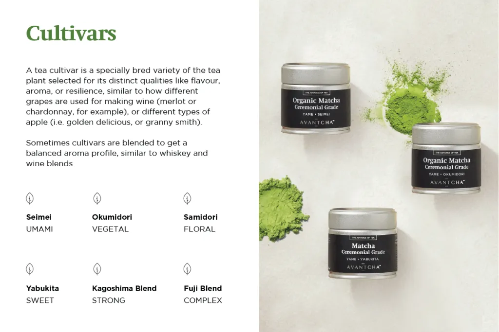 Any meaningful conversation about Matcha quality must begin with the cultivar. Cultivar is not a technical footnote; it is the foundation of aroma, colour, sweetness, texture, and overall character. Some cultivars naturally express a soft, creamy sweetness, while others lean toward vegetal or lightly astringent notes. The easiest way to understand this is to think of apples: Gala and Granny Smith belong to the same fruit family, yet their flavour profiles are unmistakably different. Matcha exists along a similarly broad spectrum, which is why AVANTCHA works with multiple cultivars to highlight the diversity that authentic, craft-produced Matcha can offer.